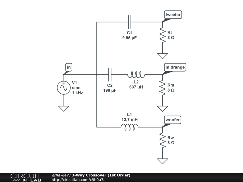 1st order 3 way crossover circuit diagram the parts list. R and c can be changed for getting different crossover frequencies. Speaker crossover wiring diagram 3 way speaker crossover wiring diagram car speaker crossover wiring diagram component speaker crossover wiring diagram every electrical arrangement is composed of various unique pieces. Wiring 2 way and 3 way speakers 2 way speakers such as home stereo or car audio component speakers are those which come as a pre designed speaker set and use a crossover. You should also review the crossover guide for help with this example. 3 way crossover design example note this sample crossover makes use of many of the calculators found on the menu on the left.